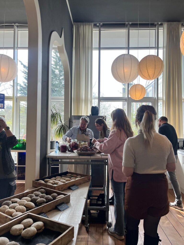 Met zo’n 60 ondernemers en studenten genoten we van een menu dat niet alleen gezond en biologisch was, maar ook volledig bestond uit plantaardige ingrediënten én lokaal geteelde producten. De lunch startte met een verrassende boerenkoolsoep met pit, natuurdesembroodjes (van gezuiverd Noordzeewater) belegd met humus, baba ganoush, rauwkost, gegrilde groenten en diverse smaakmakers. Er was een frisse koolsalade en een bijzonder assortiment gefermenteerde producten: kimchi, rode kool en daikon, met vakmanschap bereid door chefkok Fia de Pree.