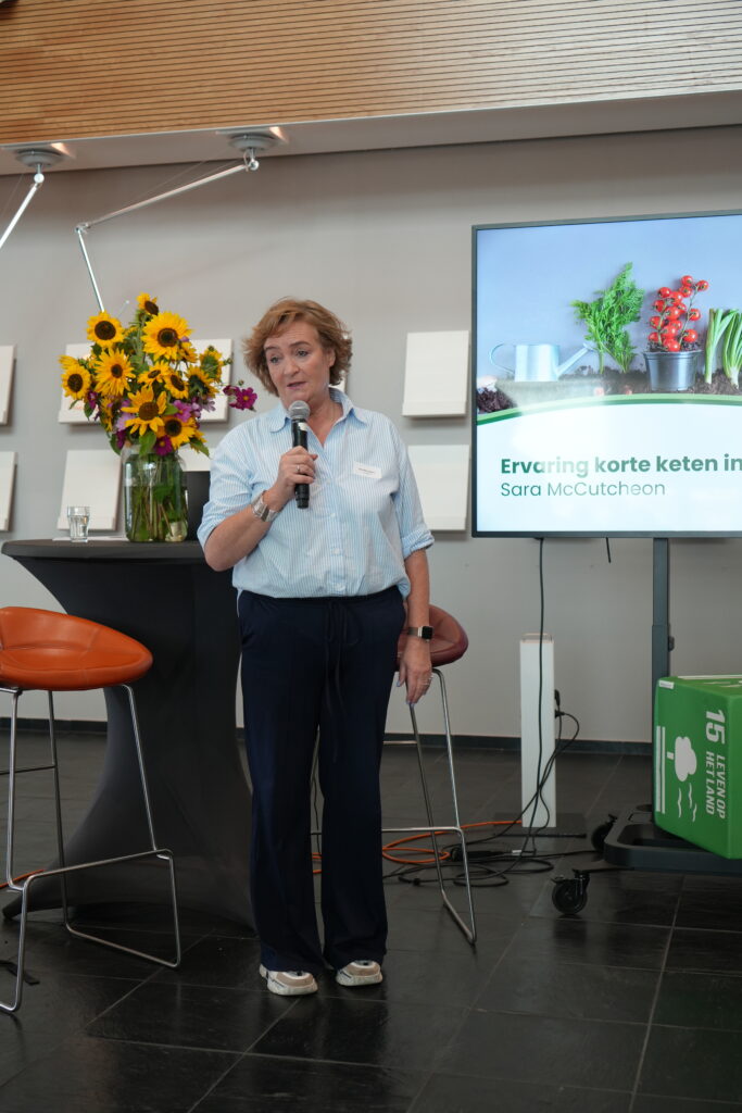 Na de lunch vertelde Karin Körver, van Tuinderij Plantalia, over haar tuinderij en het CSA-model. Ook de samenwerking tussen Plantalia en HZ University of Applied Sciences kwam aan bod. Sara McCutcheon, facilitair coördinator bij provincie Zuid-Holland, vertelde over haar ervaringen met samenwerken in de korte keten. Dit is een manier van verkopen waarbij er een rechtstreekse band is tussen producent en consument. Sara liet zien hoe samenwerken in de korte keten juist wél kan!